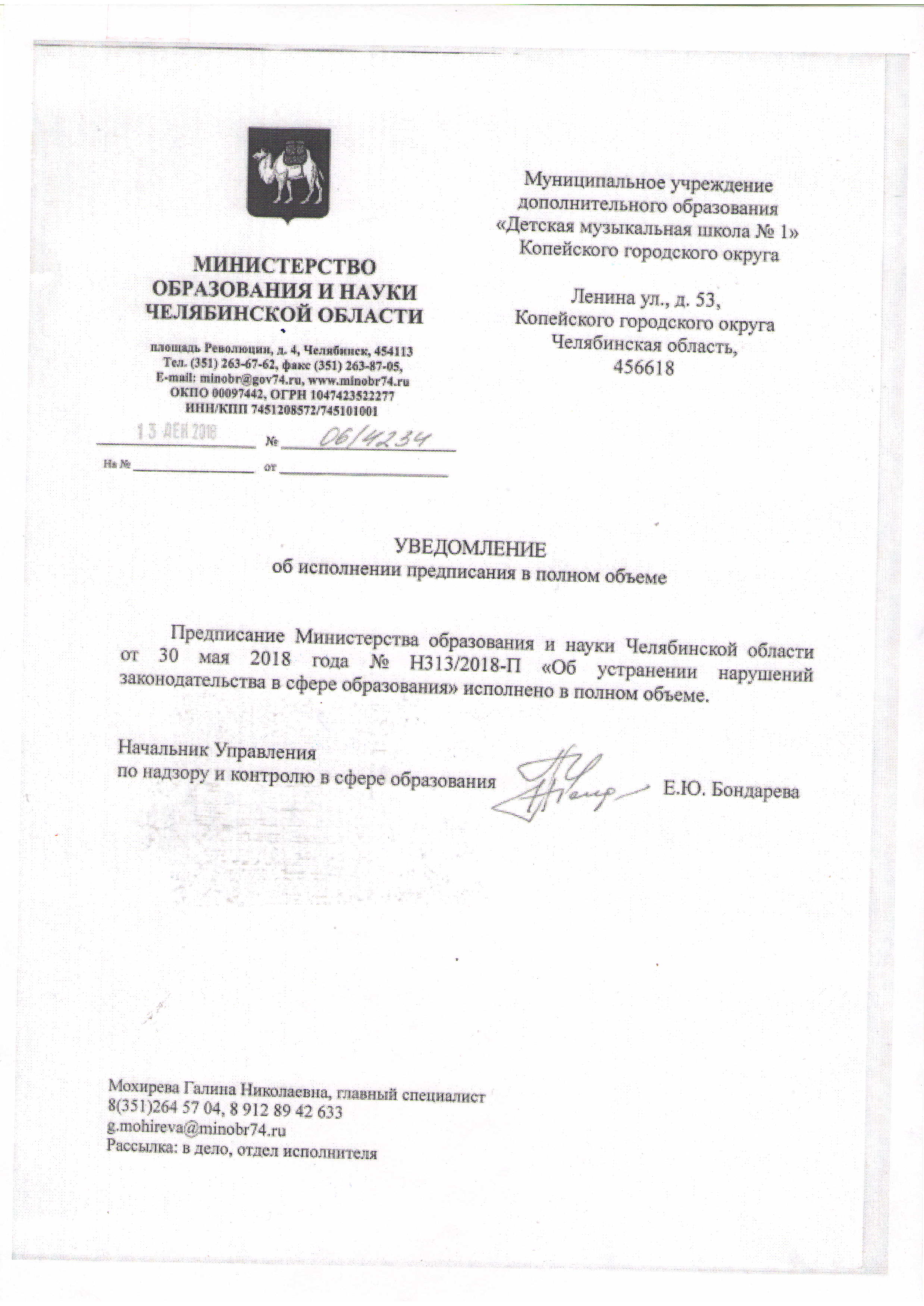 Уведомление об исполнении предписания 2018 г.